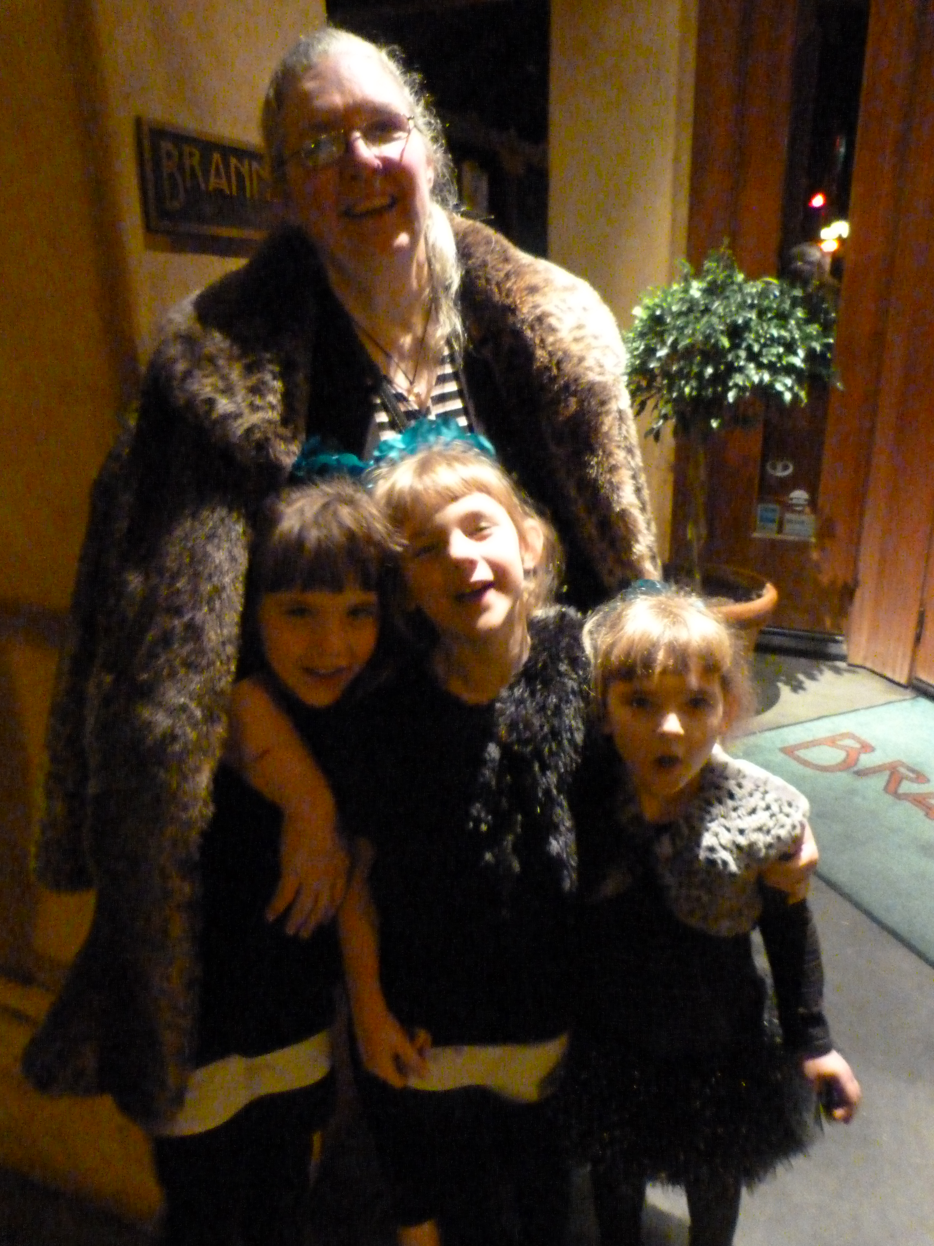 It sounds so simple, yet it was a difficult task for me.  My relationship with my mother is complicated, imperfect.  We don’t have a lot in common, and our conversations can get strained and awkward.   We didn’t get to see her over the holidays, despite my efforts to get us there (she lives about an hour away), and I have felt badly that she had to spend all of December on her own.  When the girls and I arrived to her house we brought Mom a new outfit: dress, sweater, leggings, shoes, even underwear.  My mother doesn’t get fussed over a lot, and I figured that this is something that I could do for her that no one else really does.  We had her try everything on (thankfully, it all fit and worked well together), and then she was ready for an evening out.