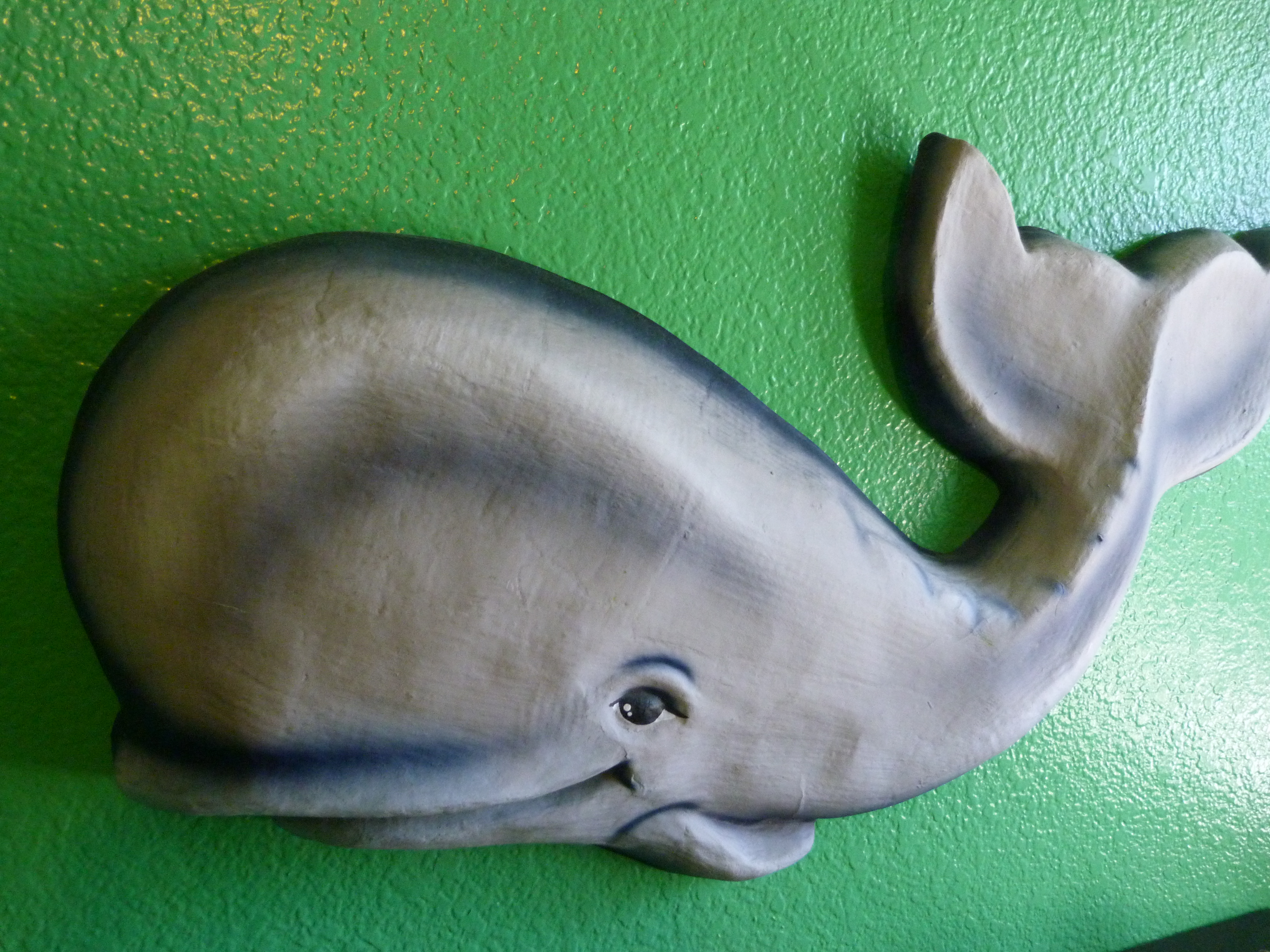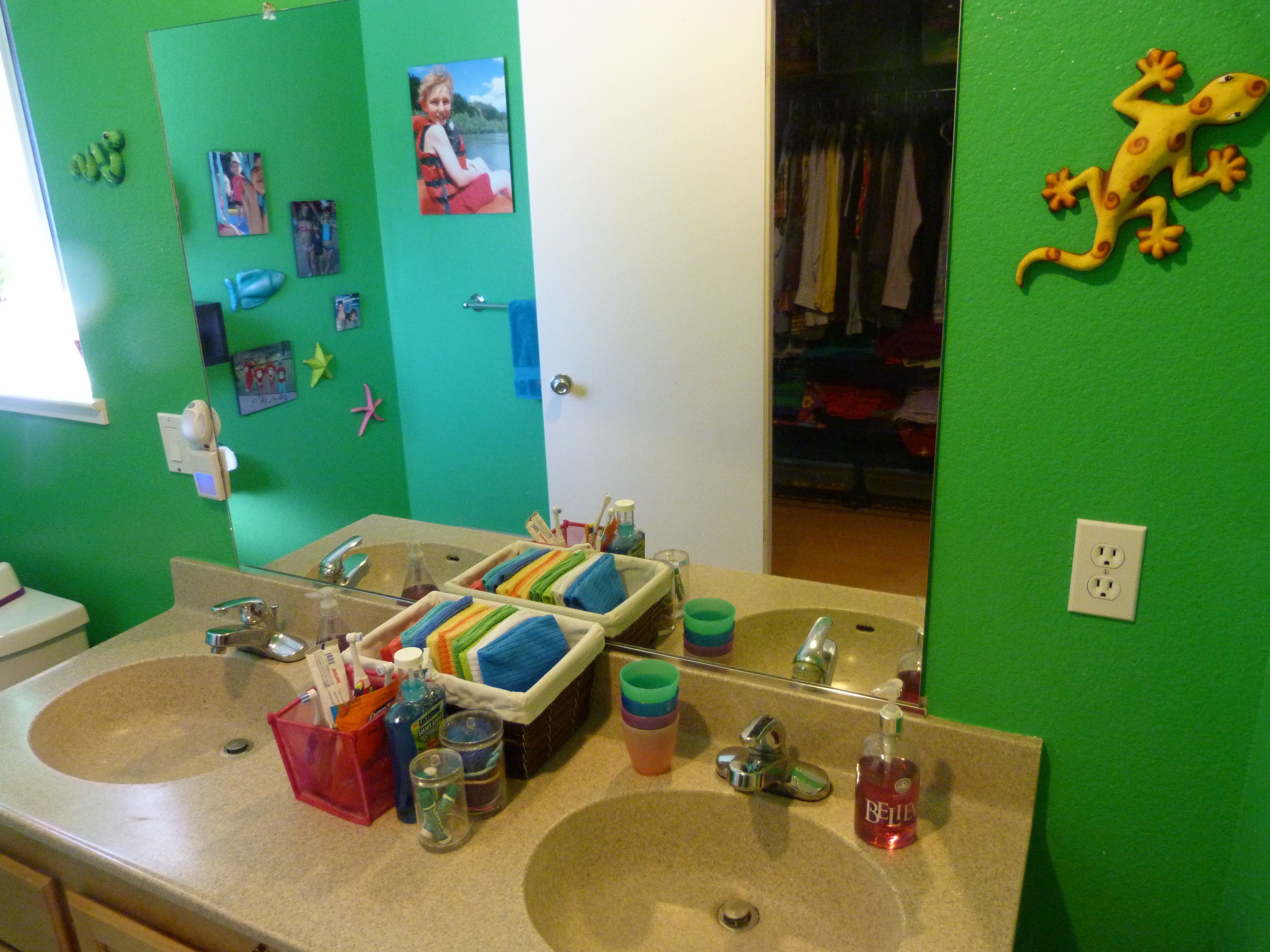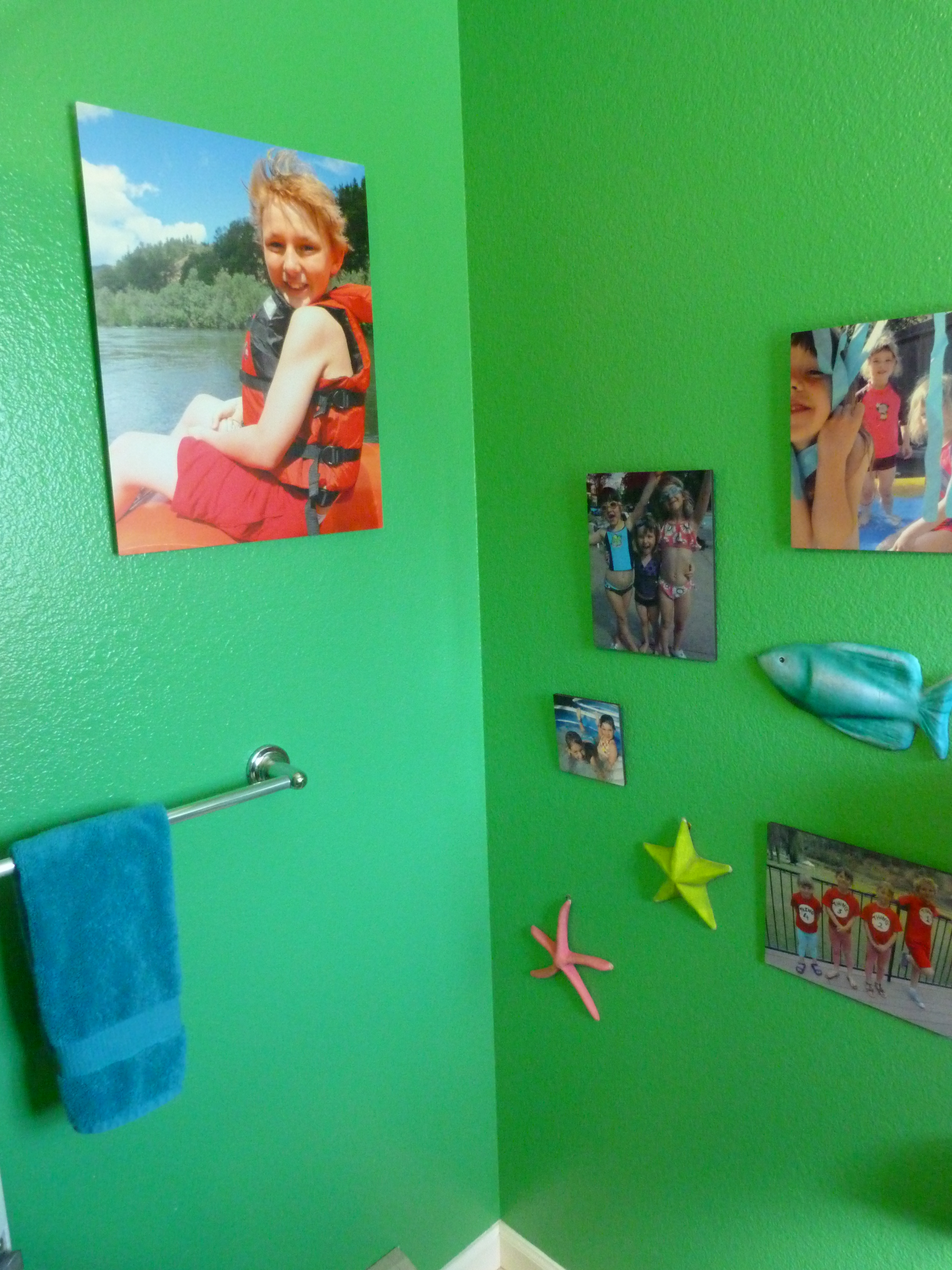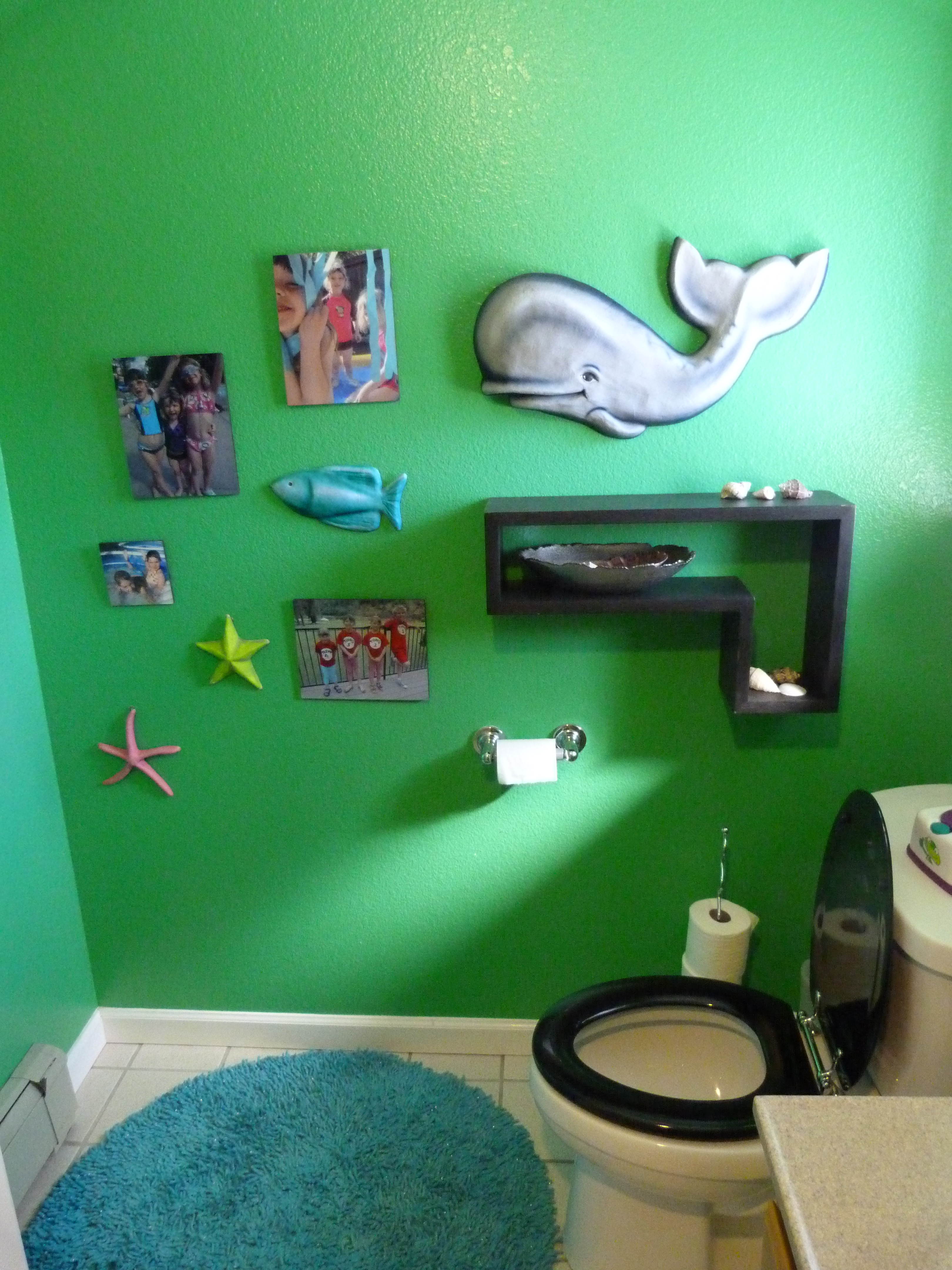 I went with a theme of “Summer”.  I had some photo enlargements printed of the kids at the pool and on a rafting trip, put up some papier mache creatures that we bought years ago in Spain, bought a couple of baskets for hand towels and bath towels, and Manly Guy hung a shelf to display pretty sea shells.